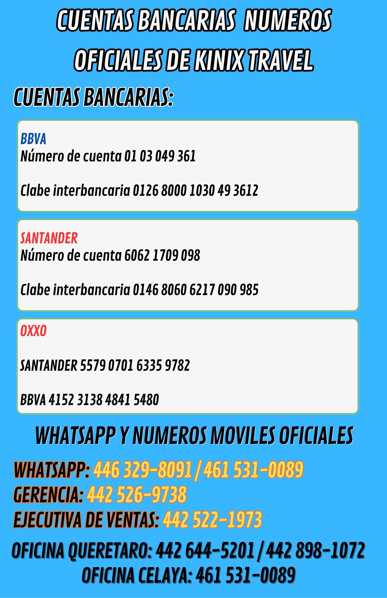 CUENTAS OFICIALES KINIX TRAVEL. Para tu tranquilidad y seguridad, estos son los únicos datos bancarios y números de contacto oficiales autorizados por Kinix Travel.